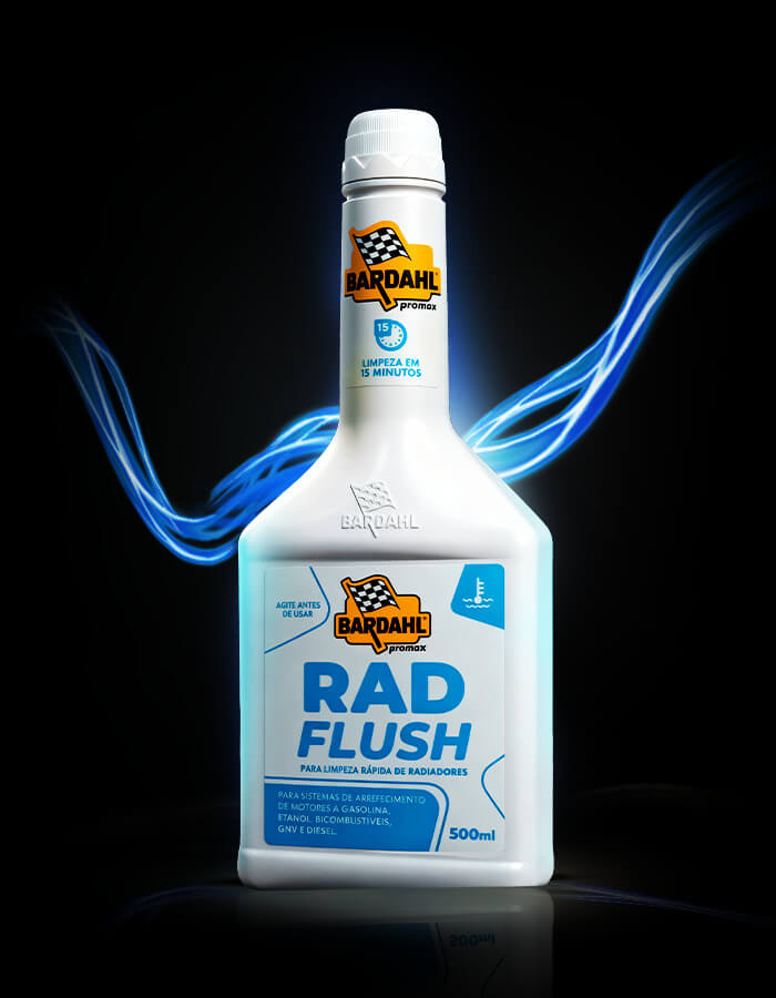 Drenar a água suja do sistema, recolocar as mangueiras, adicionar água limpa e um frasco de Bardahl Radflush. Para radiadores com volume acima de 10 litros, utilizar na proporção de 10%. Certifique-se quanto ao correto funcionamento do sistema. Caso necessário, completar o nível do fluido com água. Deixar o motor funcionar durante 15 minutos, esvaziar o sistema para drenar as impurezas e lavar até sair água limpa. Encher o reservatório com a solução composta por produtos da linha Bardahl Radflush e água limpa, seguindo as instruções contidas em suas embalagens e nos manuais dos veículos.